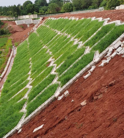 喷播植草因草种被纸浆纤维包裹,同时纸浆纤维蓄水蓄肥,不断供给草种发芽水分;而黏合剂把包裹在纸浆中草种紧紧粘附在土壤表面,形成坪床,避免降水时造成水土和种子流失。为预防雨冲蚀,在喷播后需覆盖丙纶无纺布,雨滴不直接冲打溅击地表土壤及喷播材料,而强降雨形成地表径流也从无纺布上面流走,保证了喷播材料和坡面土壤对苗木的生存环境要求。