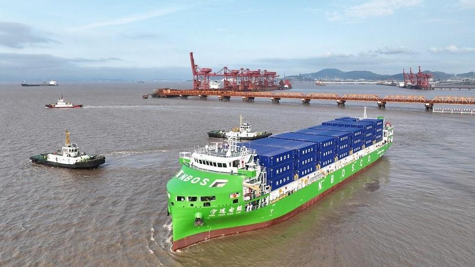 我国首艘万吨级纯电动智能集装箱船从宁波舟山港首航