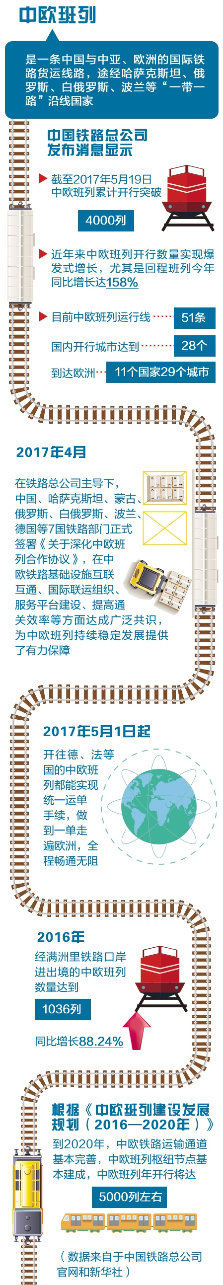 中国和欧洲,地处“一带一路”两端。但是,万水千山不是阻隔,奔驰的中欧班列实现了中欧跨越大陆的握手。截至5月19日,中欧班列累计开行突破4000列,国内开行城市28个,到达欧洲11个国家29座城市。行驶在丝绸之路上的中欧班列,承载“中国梦”而来,托起“世界梦”而行,风驰电掣中奔向共商、共建、共享的中欧黄金时代。