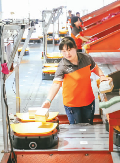 5月3日,一家物流企业的放件员将包裹放在机器人的托盘上。