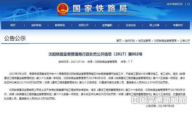 轨道交通工程领域某企业近日因工程存在偷工减料均受到国铁局处罚。