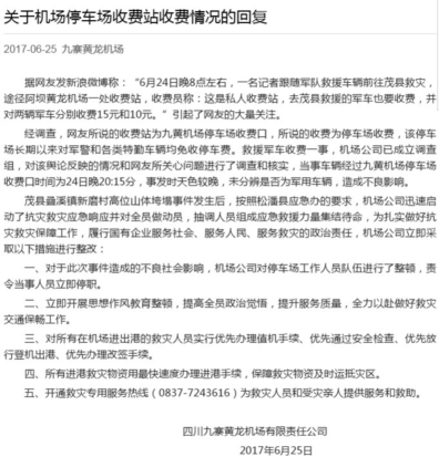 6月25日10时,九寨黄龙机场官方微信发布声明:经调查,该收费站为九黄机场停车场收费口,所说的收费为停车场收费。救援军车收费一事,机场公司进行了调查和核实,事发时天色较晚,收费员未分辨出军用车辆,造成不良影响。已责令机场公司对当事人进行停职处理,对停车场工作人员进行整顿。