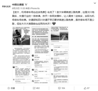 25日11时,中国交通报官方微博根据九寨黄龙机场的回应,发布微博澄清:经核实,实际为机场停车场收费。交通运输部和四川省交通运输厅早已要求高速公路免费,虽然停车场不是公路,但在大灾大难面前也应同舟共济。环球时报官方微博随后转发中国交通报微博:乱收费的不是高速公路。随后央广网、腾讯网、新浪网、网易等媒体也报道了相关调查和处理结果。