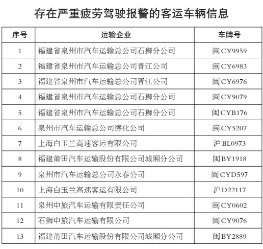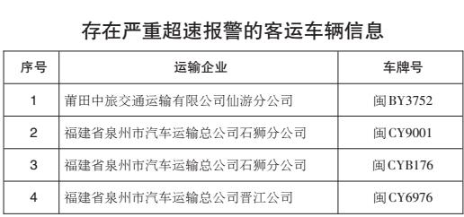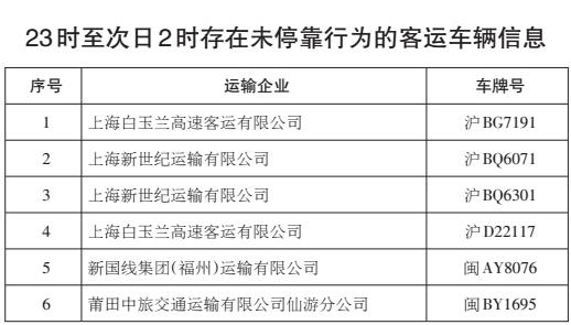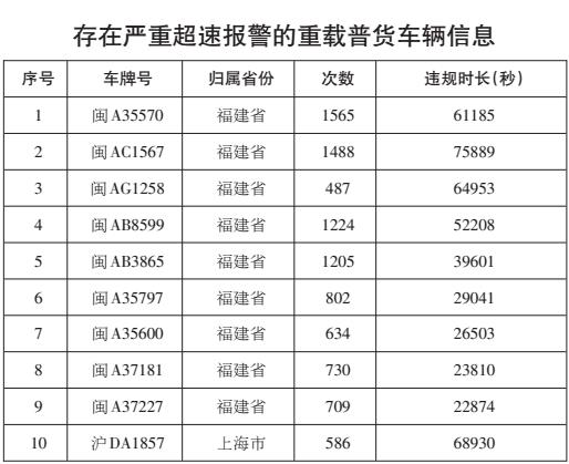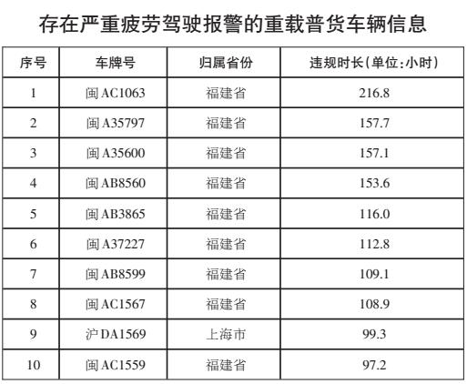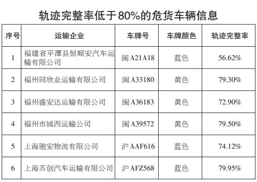 上海、福建两省(市)4辆客车、7辆危货车辆、10辆重载普货车辆车载终端存在严重的超速报警,涉嫌违规超速行驶;13辆客车、10辆重载普货车辆系统平台存在较严重的疲劳驾驶报警,涉嫌违规疲劳驾驶;6辆客车23时至次日2时存在未停靠行为,涉嫌违反接驳运输管理规定;6辆危货车辆轨迹完整率低于80%。