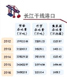 如今,长江港口实现了跨越式发展。2016年,长江干线亿吨大港增至14个,万吨级泊位增长到417个,长江干线港口完成货物吞吐量26.1亿吨,完成外贸货物吞吐量3.5亿吨,完成集装箱吞吐量1608.2万标箱。
