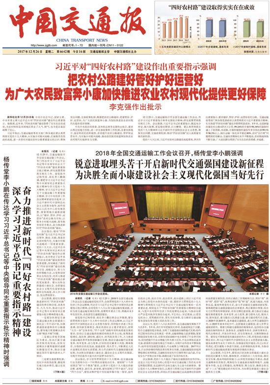 2017年12月26日,《中国交通报》刊发《习近平对“四好农村路”建设作出重要指示强调 把农村公路建好管好护好运营好 为广大农民致富奔小康加快推进农业农村现代化提供更好保障 李克强作出批示》。