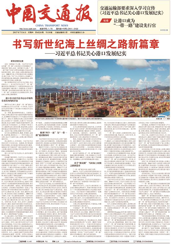 2017年7月6日,《中国交通报》刊发《书写新世纪海上丝绸之路新篇章——习近平总书记关心港口发展纪实》。