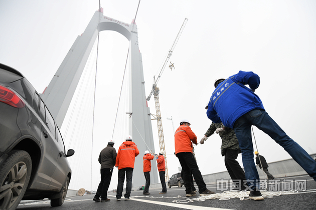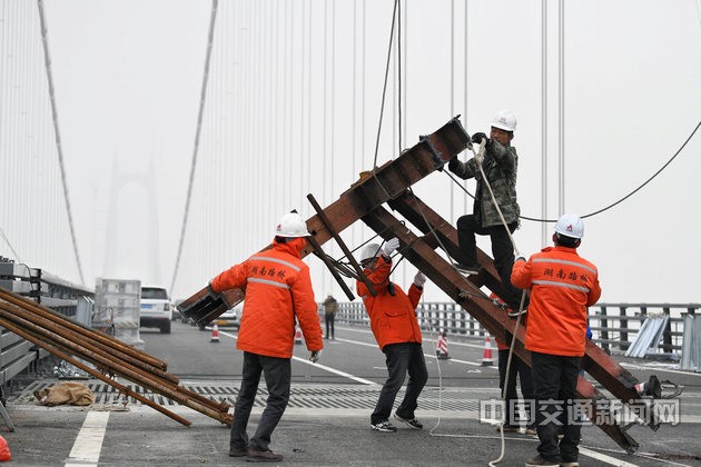 洞庭湖大桥现场工作人员利用风缆绳进行作业。 李宁 摄