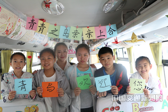 在交运温馨校车上,随车照管员周妍与学生将车厢装饰成“喜迎上合”主题,迎接上合组织峰会的到来。高伟绪 供图