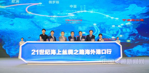 浙江省副省长高兴夫,宁波市委副书记、市长裘东耀,外交部国际经济司大使王小龙,中宣部新闻局研究处处长赵磊,交通运输部政策研究室副巡视员李占川,中国交通报社总编辑、党委副书记李咏梅,媒体代表新华社记者魏一骏共同按下启动按钮。