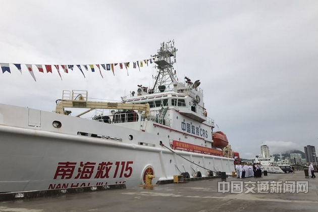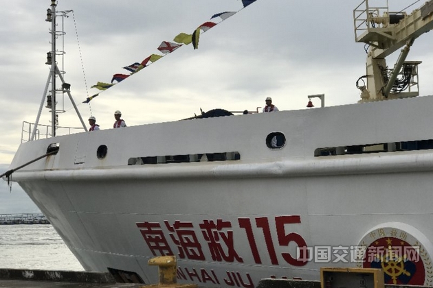 “南海救115”轮是我国自行设计建造的现代化专业海洋救助船舶,主机功率达到9000千瓦,满载排水量超过5000吨,系柱拖力109吨,航速大于20节,续航能力1万海里、30天;能在9级海况(14米浪高、12级风力)条件下出动,可在6级海况(6米浪高、9级风力)条件下实施救助;拥有飞行平台,可临时起降中型救助直升机。