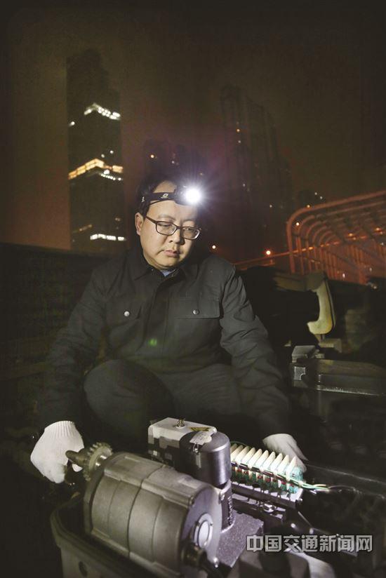 隆冬深夜,高架线路行车区间寒气逼人,毛文迪开启转辙机箱盒,仔细检查各接线是否良好,对各部位螺栓和锁闭杆件进行清洁、紧固和涂油……道岔连接处与锁钩之间的缝隙只有几厘米,戴着手套无法完全清除细小杂物,他们就单膝跪地脱去手套,赤手在冰冷的铁件缝隙中一点点掏去所有杂物。