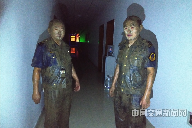 都汶高速公路交通执法人员不畏艰险勘查灾情,回到驻地已是泥垢满身、伤痕累累。梁爽 摄