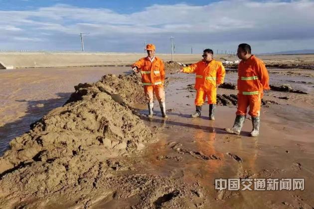 去年8月,连续的强降雨导致G3011线K444处发生严重水毁,白天大柴旦公路段的公路养护人员站在齐腰深的水中修筑拦洪坝,大家扛起沙袋在水中穿梭,从未喊苦,只有战胜洪灾的决心和毅力;夜晚为了确保车辆顺利通行,人站在水里作路标,为车辆指引前行的道路。
