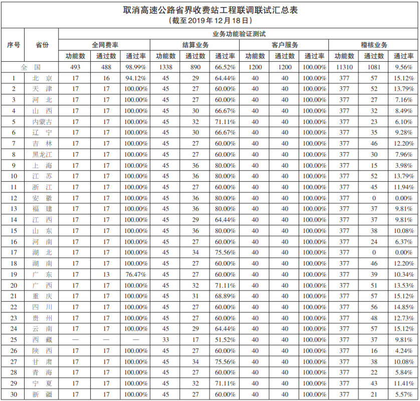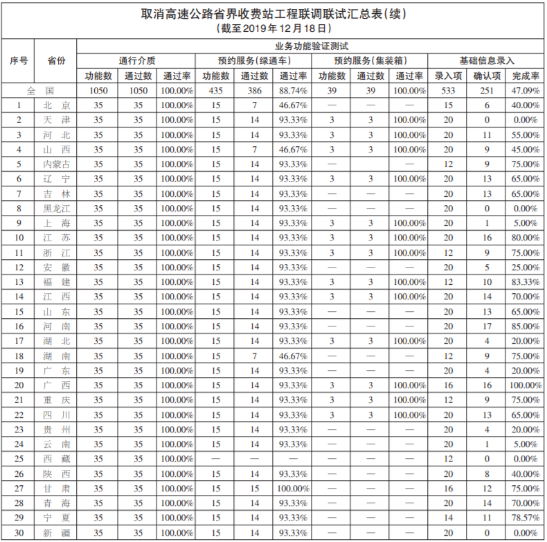 5.通行介质验证。30个省份(含西藏)共有1050个功能需验证,已全部通过。