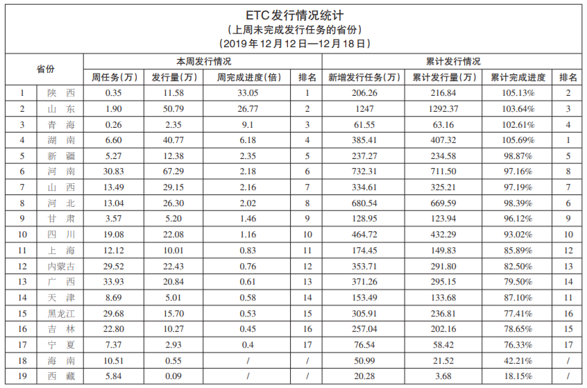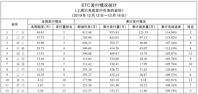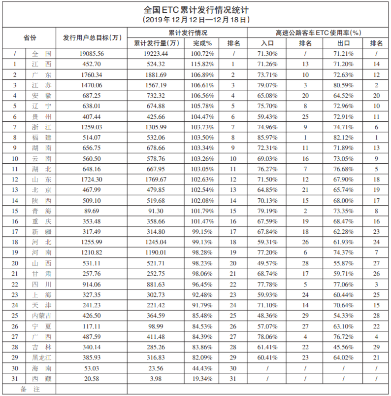 截至12月18日,全国ETC客户累计达到19223.44万,完成发行总目标19085.56万的100.72%。其中,前3名的省份是:江西(115.82%)、广东(106.89%)和江苏(106.61%);后3名的省份是:黑龙江(82.09%)、吉林(83.86%)和广西(84.39%)。