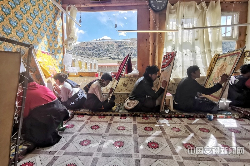 在壤巴拉觉囊唐卡传习所,学员们专心创作。记者 李宁 摄