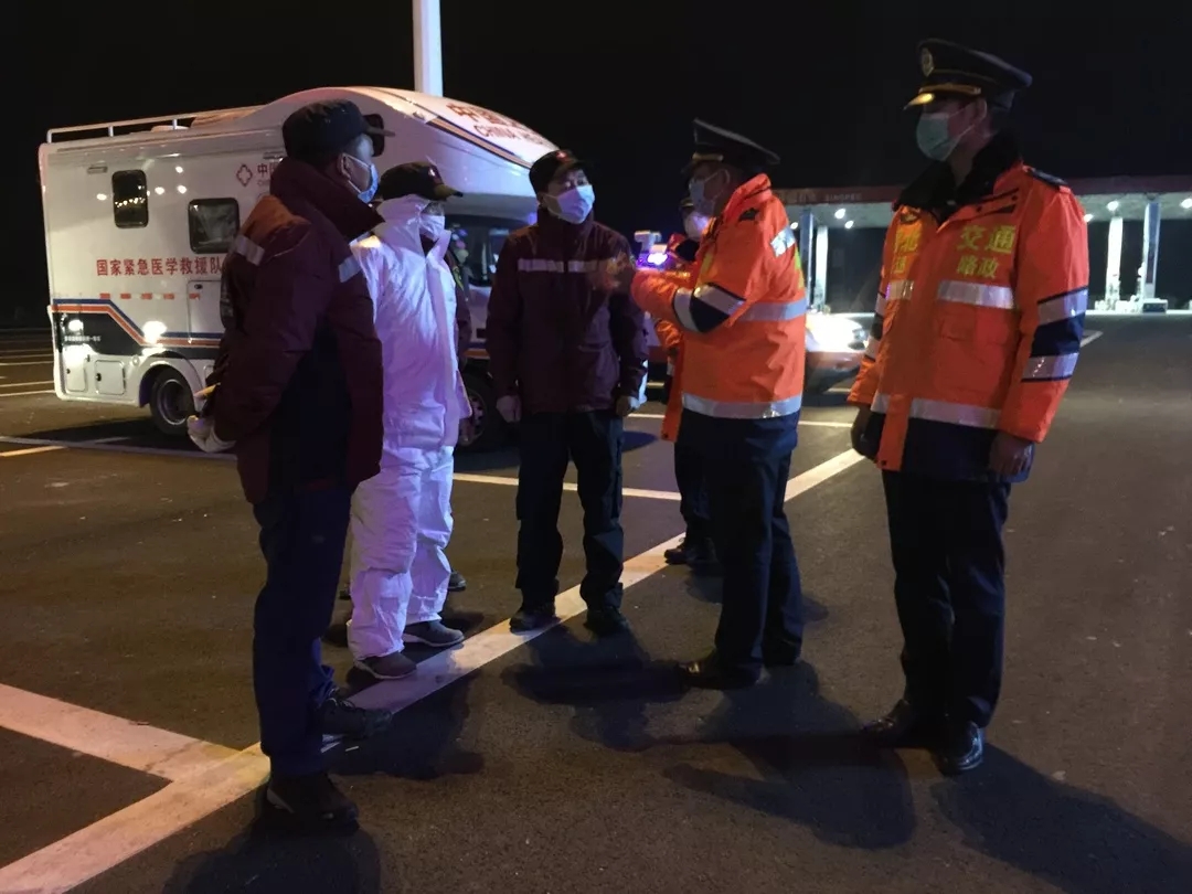 医疗队在服务区短暂休息后,护送专班警戒开道,一前一后,护送救援车队向武汉进发,于5日00时40分顺利到达指定地点武汉市东西湖区。