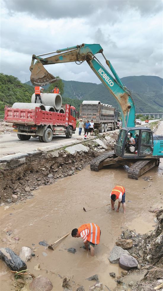 四川凉山冕宁交通运输抢险力量,全力修复108国道与大马乌村农村公路连接线的损毁路基。安吉 摄