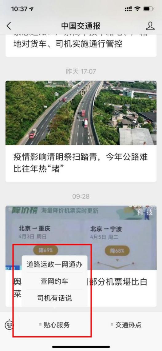 (3)强化建设公共服务平台方面,在“中国交通报”官方微信增设《贴心服务》专栏,已开设“道路运政一网通办”“查网约车”“司机有话说”等办事渠道。