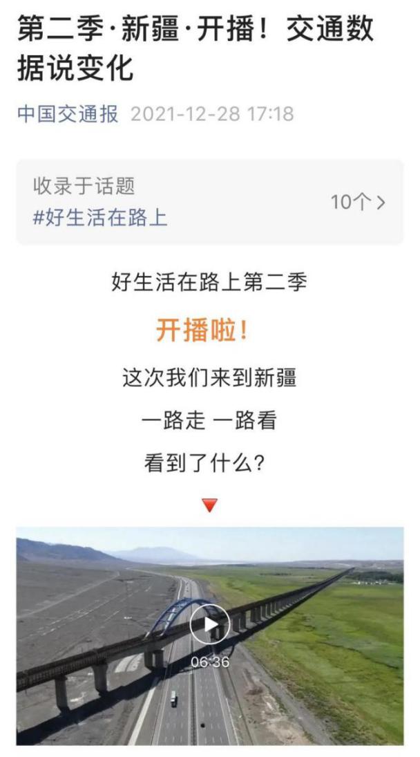 “好生活在路上”新疆交通运输成就融媒体宣传项目,包含特刊、1部专题片、5部短纪录片,全网浏览量4亿余次,入选国家新闻出版署“2021年中国报业深度融合发展创新案例”。