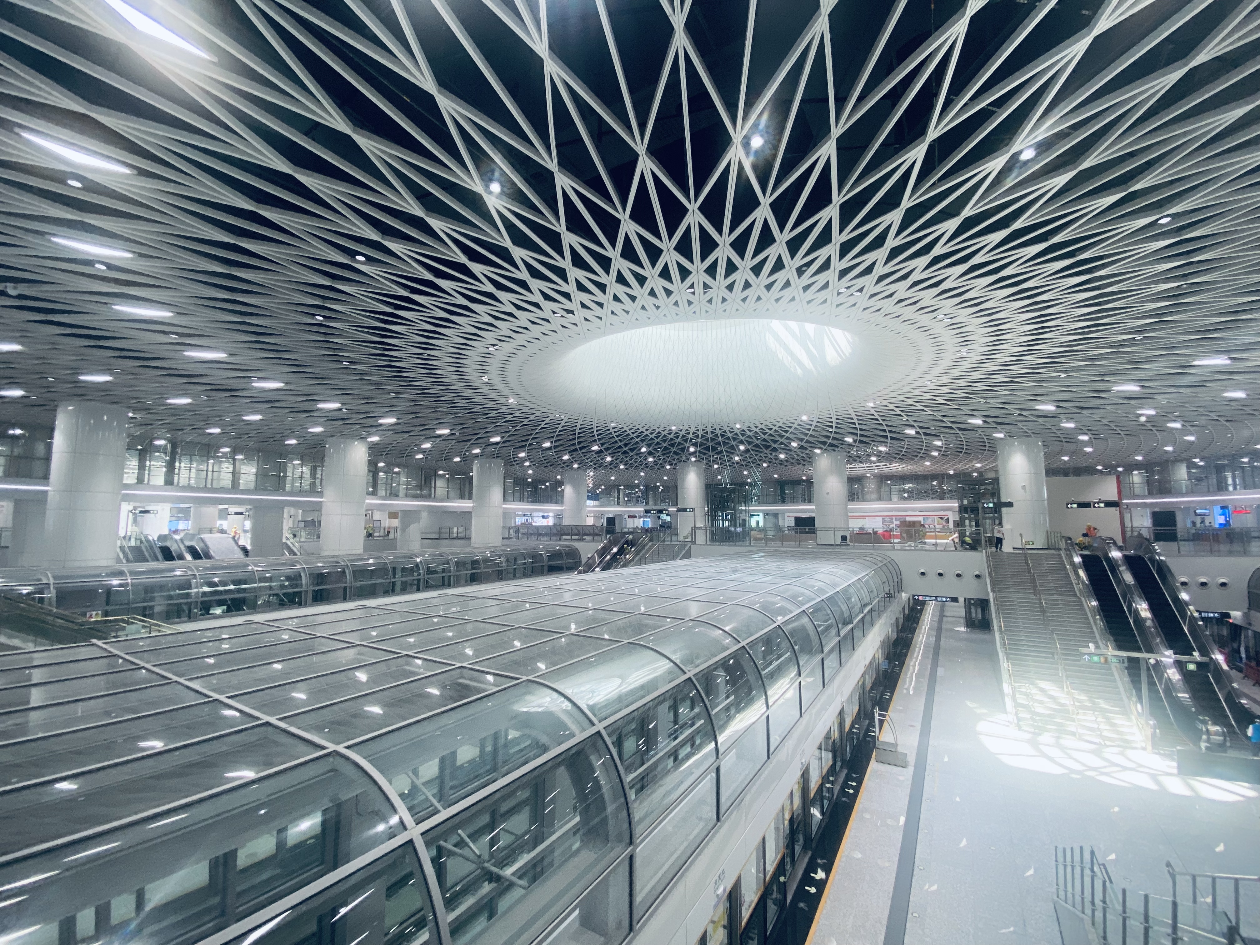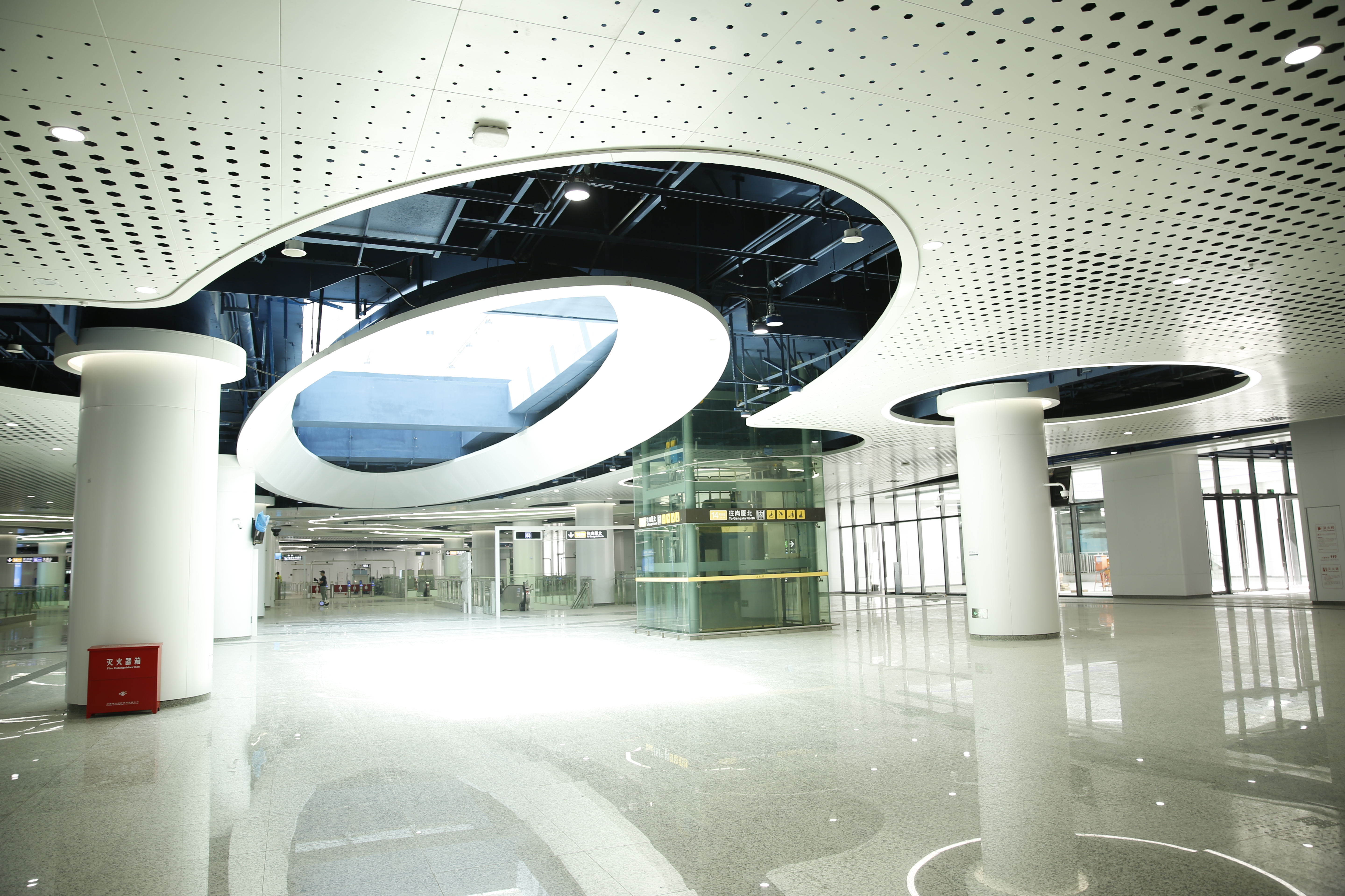以“深圳之眼”为主题,引入费马螺旋,双向延伸,中庭设有25个自然采光天井,将自然光引入地下,建成“深圳最美地铁站”。