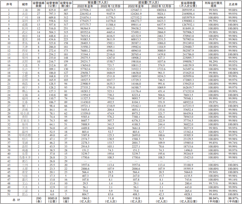 截至2022年12月31日,31个省(自治区、直辖市)和新疆生产建设兵团共有53个城市开通运营城市轨道交通线路290条,运营里程9584公里,车站5609座。