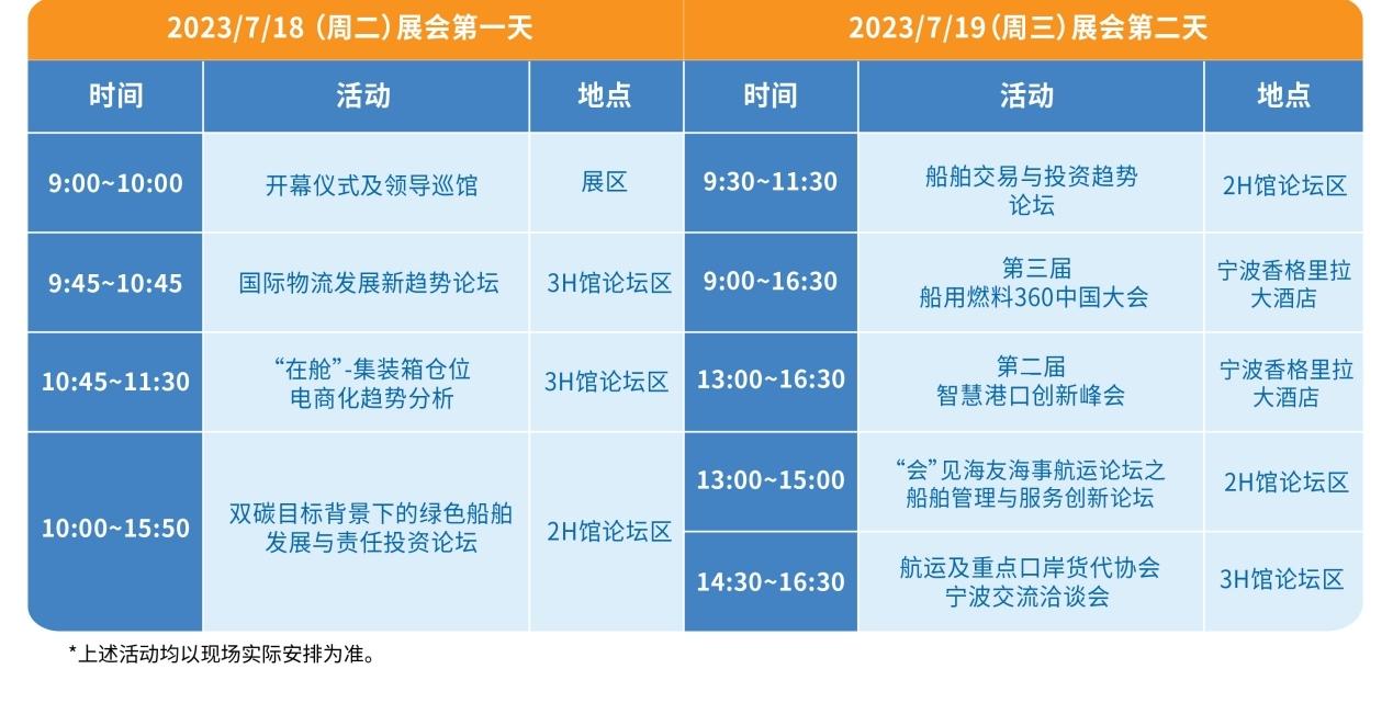 7月18日-20日,展会在宁波国际会展中心举办,展览面积达22,000平方米。其中,1号馆为海洋经济发展成果、国际展区,2号馆为海事服务、船舶海工、船舶配套展区,3号馆为航运服贸、智慧港航展区,4号馆为海洋科技、海洋新材料、船艇生活展区。