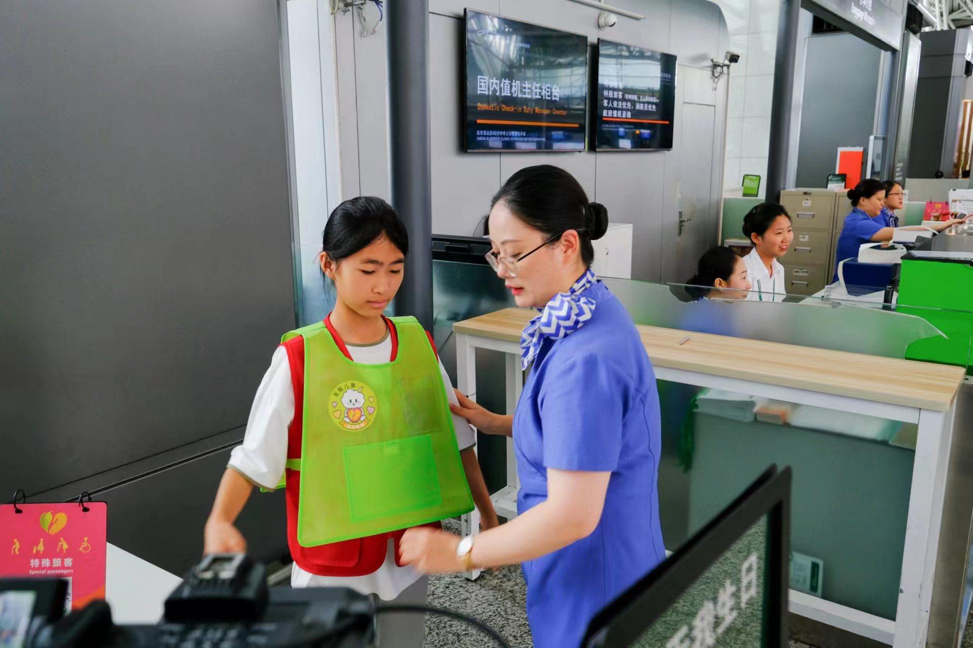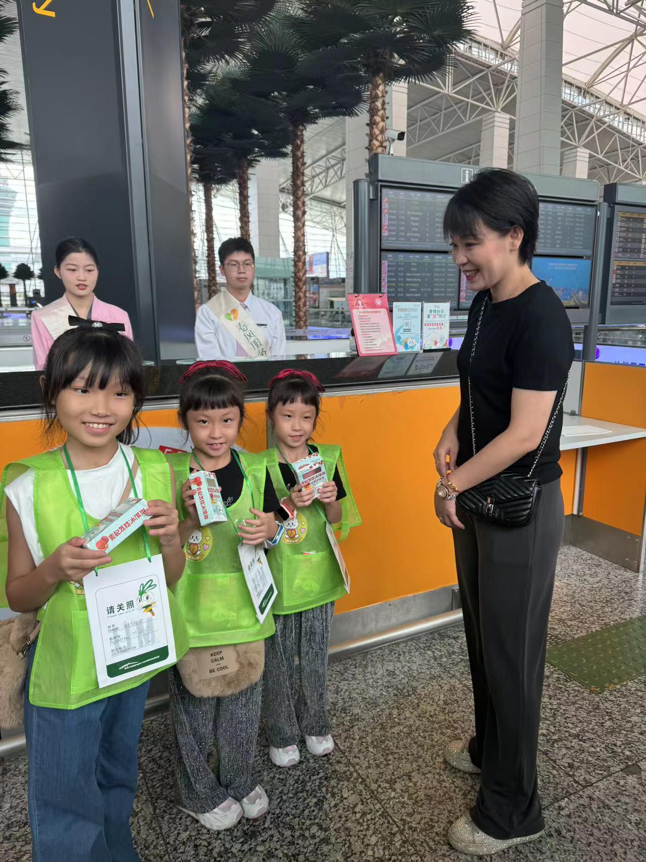 在出发厅值班主任柜台,几名“单飞”的小旅客由家长交付给了机场工作人员,工作人员为他们穿上小马甲、填写核对好航班信息。在开启飞行旅程前,小朋友们迫不及待跑到旁边的雪糕车上,免费体验白云机场刚刚推出的文创产品——“荔枝冰淇淋”。