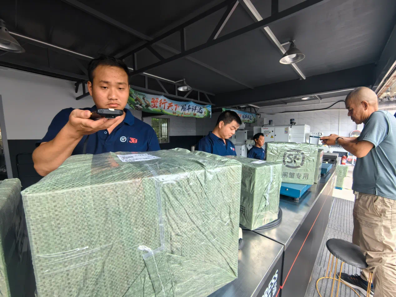 快时效的背后是贯穿全环节的提速。在揽收端,今年京东快递在阳澄湖地区大闸蟹产区投入超千名快递员揽收作业,帮助蟹农打包寄递。在分拣方面,京东快递在阳澄湖、兴化地区投用两个超1万平方米的临时分拣中心,揽收的大闸蟹可以第一时间转运发出。在运输方面,京东快递通过加密京津冀、珠三角地区的航线,投入全货机、散航近百条,辅以干线拉直、高铁直发等方式,全力保障鲜活大闸蟹第一时间送达消费者手中。