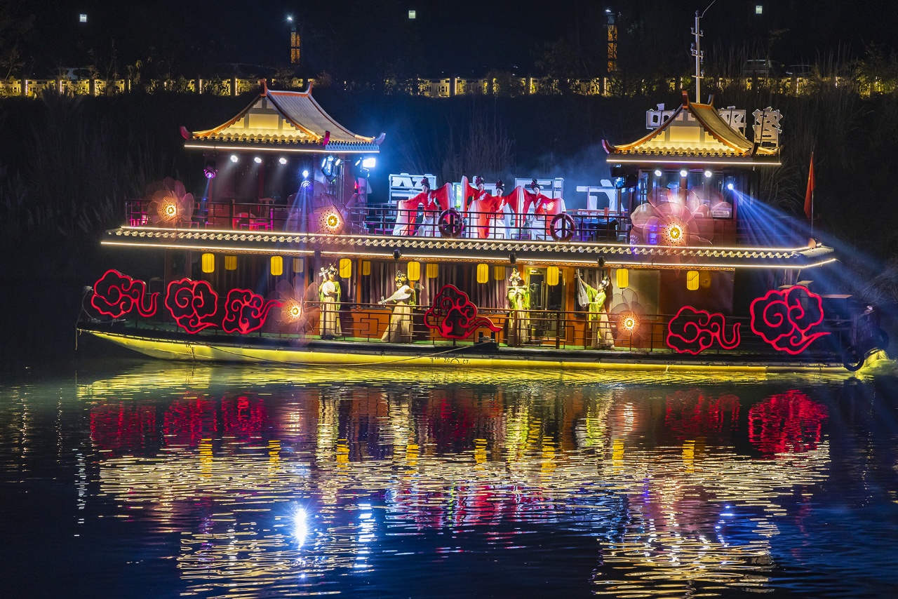 嘉陵江温柔环抱古城,造就了“水嵌山怀、城浮水上、人游舟中”的奇景。乘画舫畅游,近览古城黛瓦粉墙的倒影在波光中摇曳,远眺白塔凌云、锦屏叠翠。更有《客来阆中》环江实景演出(时长60分钟,入选省级消费新场景),船岸互动,灯光与山水交融,让人沉浸式感受“嘉陵江色何所似?石黛碧玉相因依”的千年咏叹。