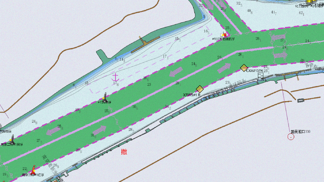 航标调整:本次调整设置XSWS#2 R虚拟AIS航标、XSWS#1 Z虚拟AIS航标、新生圩施专用浮,撤除XSWS#3 Z虚拟AIS航标、XSWS#4 Z虚拟AIS航标、XSWS#5 Z虚拟AIS航标。经过调整,施工区条件得到有效改善。具体如下图: