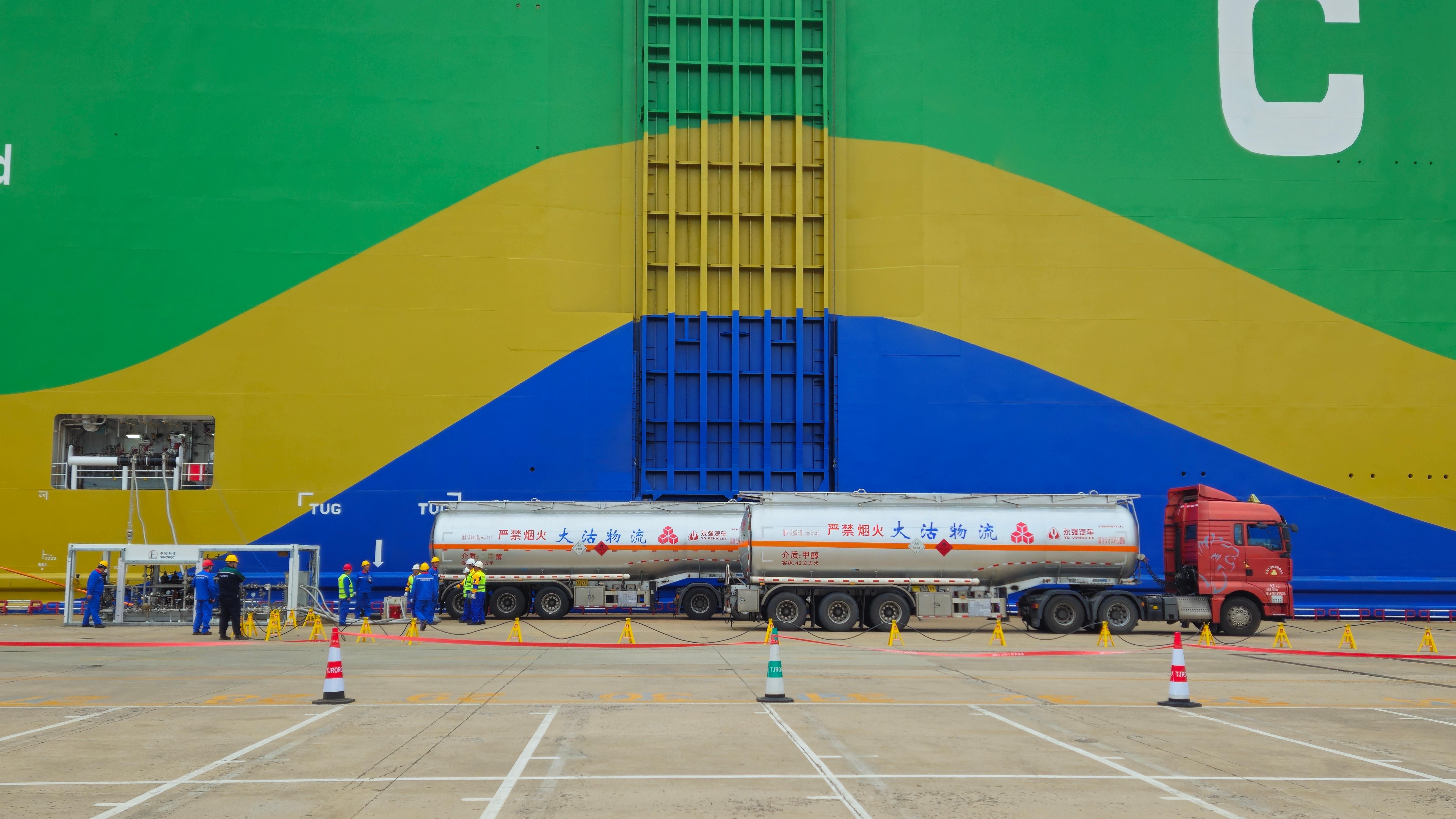当天,在天津市政府相关部门及口岸单位的大力支持下,“港荣”轮在天津港成功进行全国首次滚装船绿色甲醇加注作业,累计加注绿色甲醇约300吨,可减少二氧化碳排放460吨,标志着天津港已建立起了完备的甲醇加注体系。当前,全球港航业正积极探索清洁燃料的加速应用路径,甲醇作为国际航行船舶低碳转型的替代燃料,已成为行业新选择。此次天津港实现全国首次滚装船绿色甲醇加注,为全球航运低碳转型提供了“天津方案”。