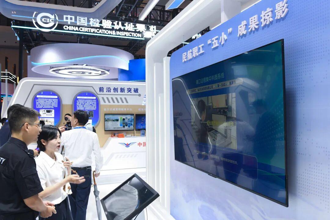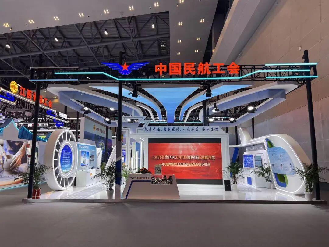 中国民航工会展区以“匠心铸梦,翼展蓝天”为主题,分为民航职工“五小”创新成果、前沿创新突破、职工创新文化三个板块。民航职工“五小”创新成果板块撷取以监控镜头智能除湿除雾装置等为代表的80项一线生产部门职工创新创造成果,展现民航创新创造的基础性、广泛性;前沿创新突破板块撷取以C919国产大飞机适航审定为代表的10余项技术发明、创新创造和革新成果,展现民航适航审定、低空经济等前沿领域创新创造成果的前瞻性、突破性;职工创新文化板块撷取民航4位“大国工匠培育对象”、20位“首批民航工匠”、3个全国劳模和工匠人才创新工作室、10个民航劳模和工匠人才创新工作室风采及其创新成果,展现以他们为代表的劳模工匠在塑造民航工匠文化生态中的有生力量。