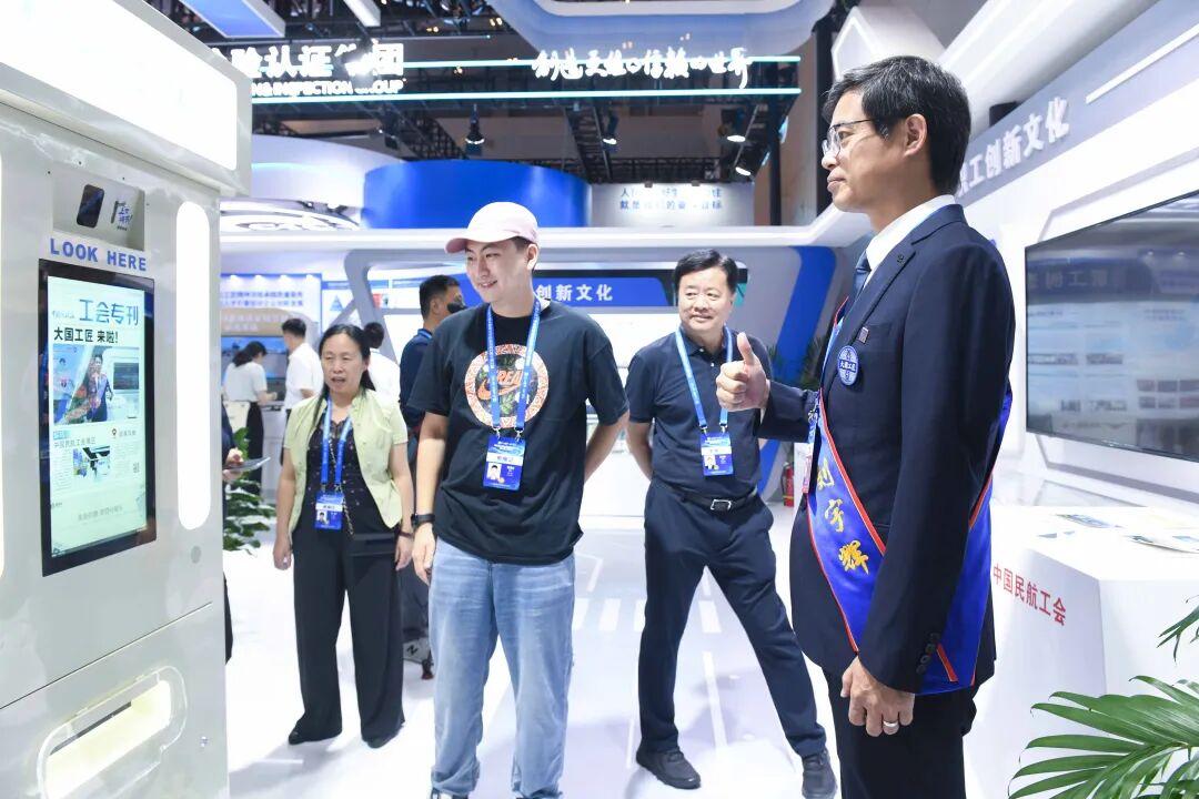 中国民航工会展区融入了飞机、发动机、塔台等民航特色元素,吸引了来自全国各地的观众前来观看,身临其境了解民航职工创新创造成果,感受民航职工创新实力和创新文化。观众在国产大飞机C919适航审定展板前,了解适航审定工作默默无闻的艰苦付出和突破性成就;饶有兴致地戴上VR(虚拟现实)眼镜开展机务检修,体验南航机务创新带来的高效、便利和民航人对航空安全执着专注、精益求精、一丝不苟、追求卓越的坚持。