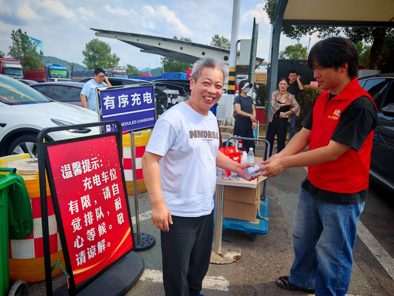 大墅、宁国、君王、丰乐等服务区在充电桩附近搭建“暖心补给站”和休息区,为排队等待充电的司乘免费提供矿泉水、零食、定制帆布包及充电指引等服务,营造了温馨舒适的出行氛围。