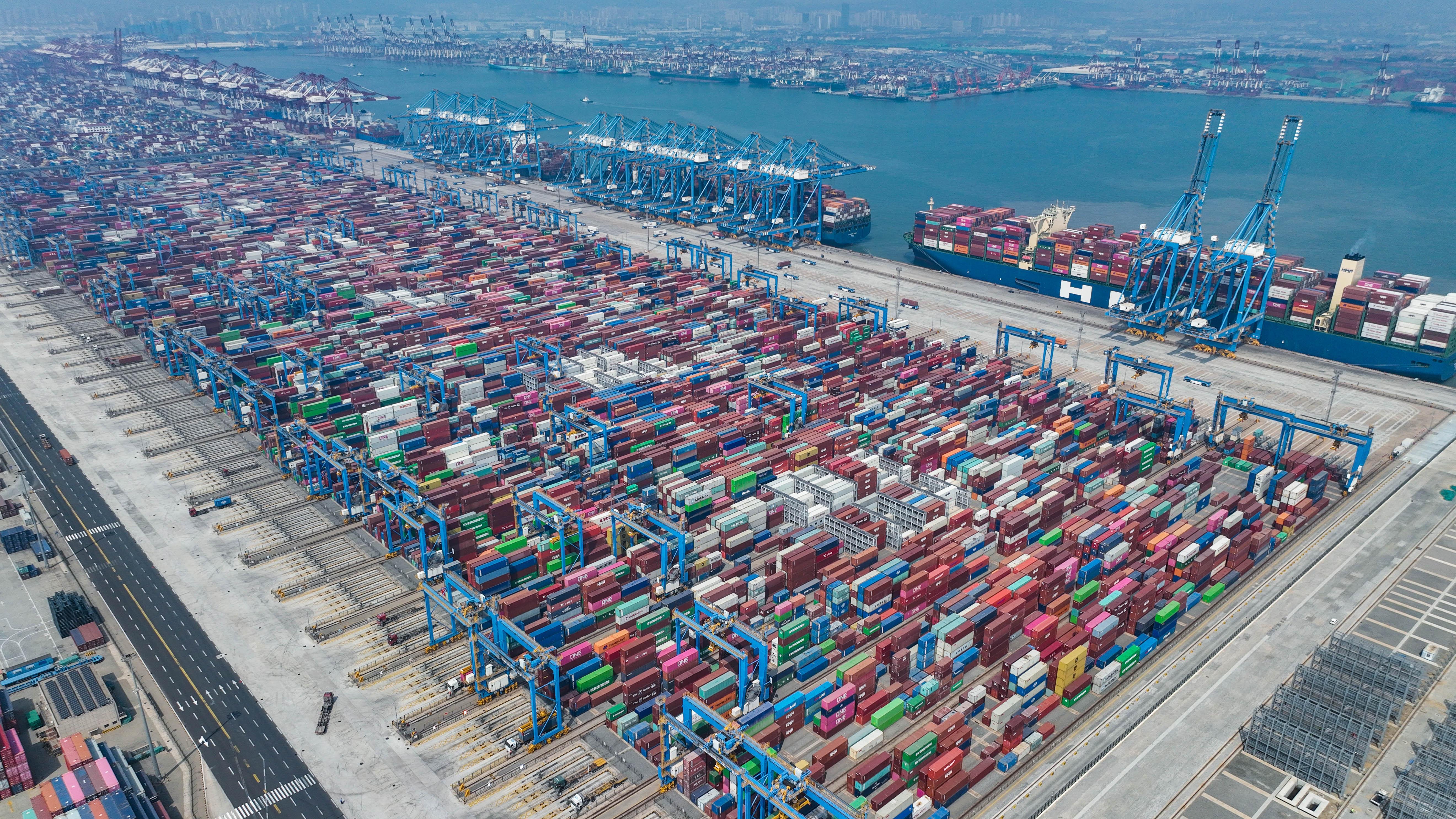 正午的青岛港生产调度指挥中心,多块拼接屏组成的“生产大脑”正精准呈现五大港区的繁忙作业场景,各类大船满载货物迎来送往,驶向全球各地,生动展现了我国外贸发展的强劲动能。