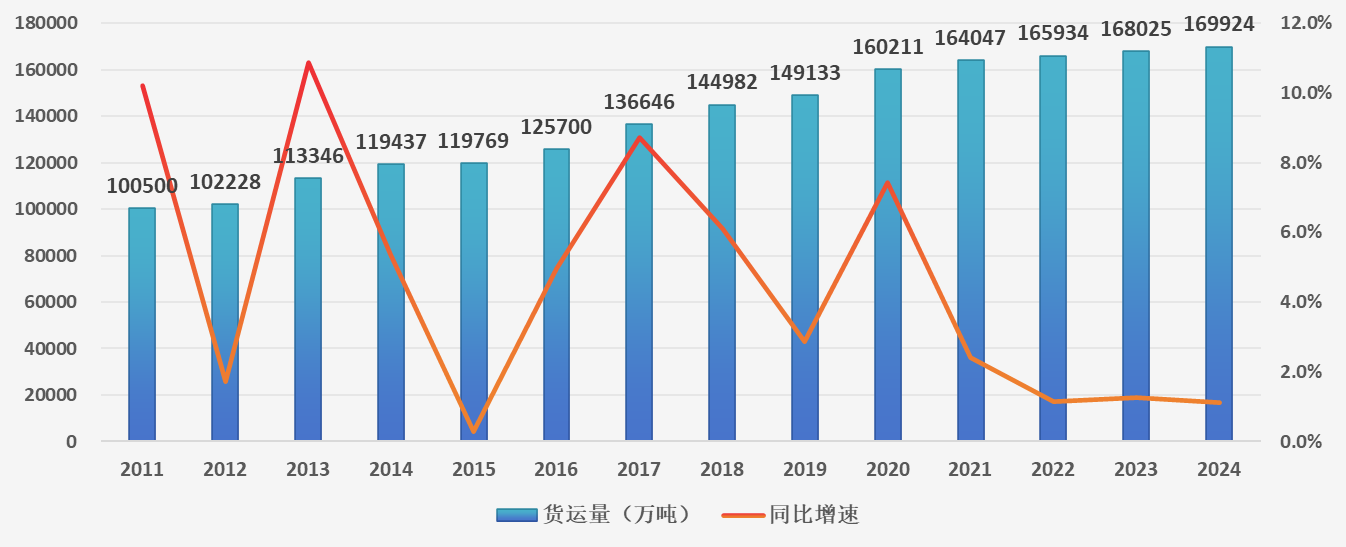 图1 2011-2024年长江口南北槽航道货运总量与增速