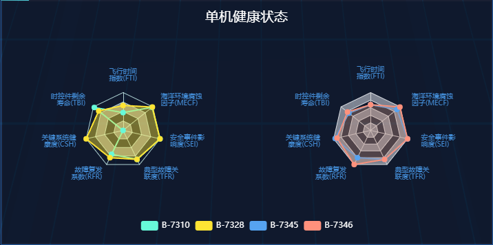 该模型围绕“3故、2时、2指数”核心架构,即:关键系统故障、重复性故障和设计原因故障;飞机使用时间和关键系统剩余时间;安全指数和针对海上作业环境开发的海洋环境腐蚀指数。其中,首次创新性地将海洋环境腐蚀量化指数纳入评估体系,让评估更贴合海上作业飞机真实情况。在此基础上,模型通过动态评分规则,实现了从依赖经验的“定性判断”到基于数据的“定量评估”的根本性转变。同时模型与东二飞智慧维修管理平台深度集成,通过制定直观的“颜色—提示—措施”分级维护策略,实现了健康状态“一屏感知”。