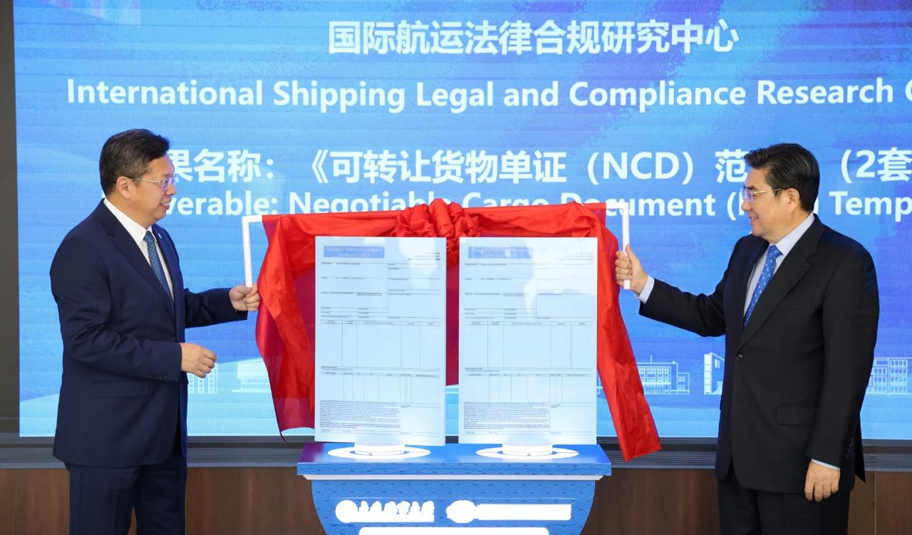 “全球航运供应链数智化建设与规则应对”分论坛上,举行了《可转让货物单证(NCD)范本》(2套)成果发布会,该成果由中国远洋海运集团有限公司与大连海事大学联合成立的国际海事法律合规研究中心完成,张勇与大连海事大学党委书记许民强共同发布成果,大连海事大学法学院院长朱作贤作成果解读。
