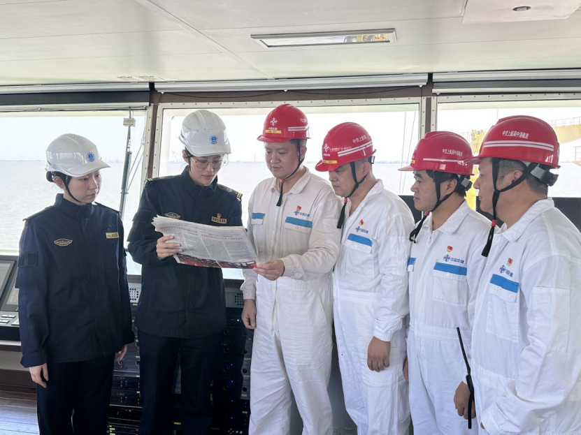 此外,海事工作人员还主动登上正在参与连云港徐圩港区30万吨级航道改扩建工程的“航浚4018”轮,与该轮党员共同开展党的二十届四中全会精神联学活动。他们结合水上工作实际,围绕服务国家重大战略、推动海洋经济高质量发展等内容展开深入交流,将理论学习延伸到项目一线、船舶甲板,实现政策宣讲与基层实践的同频共振。