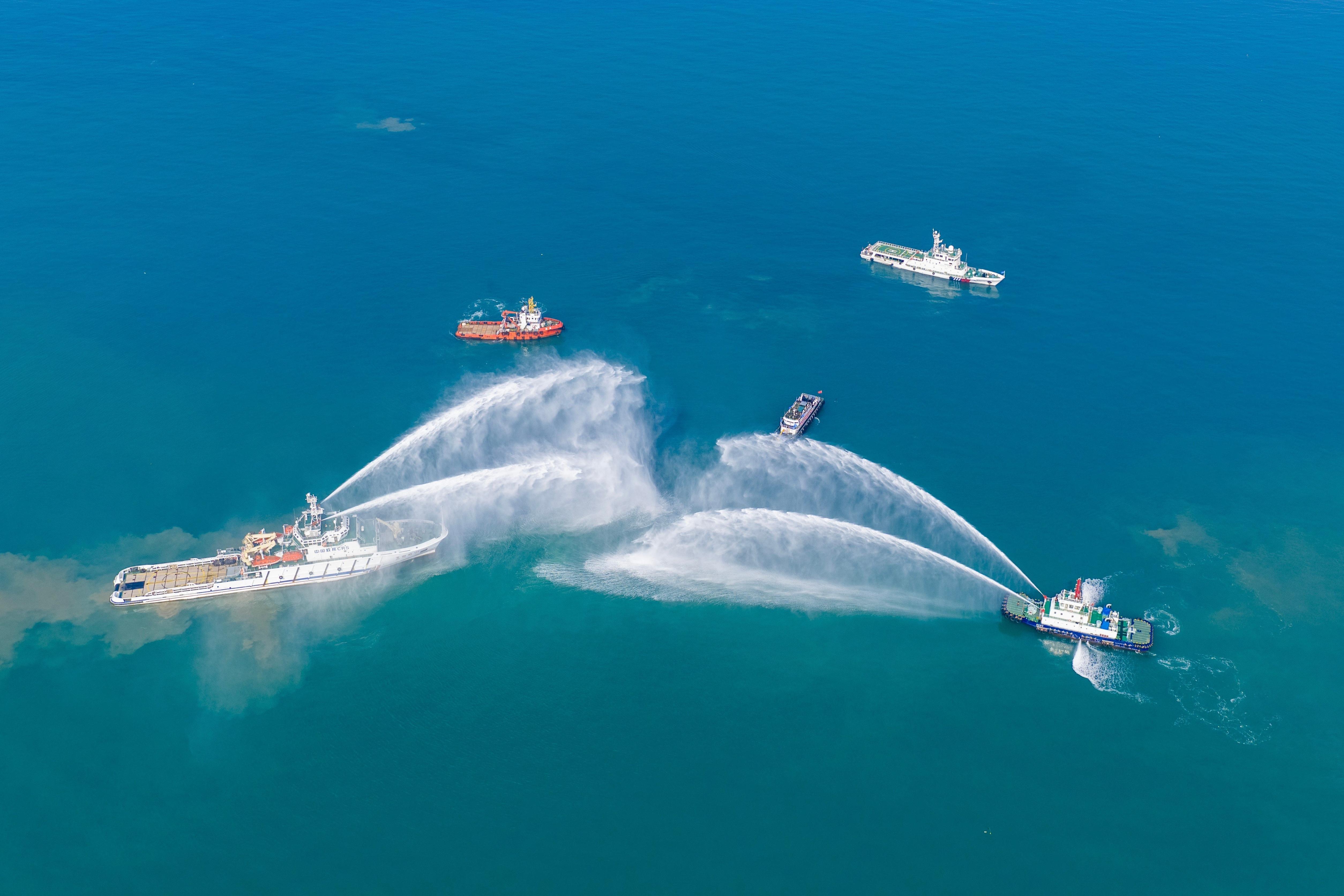 在“船舶消防灭火”阶段,“润航118”轮模拟油舱起火,在“海巡0571”轮现场指挥下,“北海救111”轮与“青港拖30”轮迅速响应,在“德涞”轮现场警戒下,利用消防水炮实施外围冷却与灭火作业,展现出专业船舶在海上火灾处置中的关键能力。随后的“溢油围控与回收”中,“航顺106”“航顺107”与“容海清污1号”等船舶迅速布设围油栏并开展溢油回收,配合无人机监测与消油剂喷洒,有效控制了海上油污扩散,保护了海洋环境。