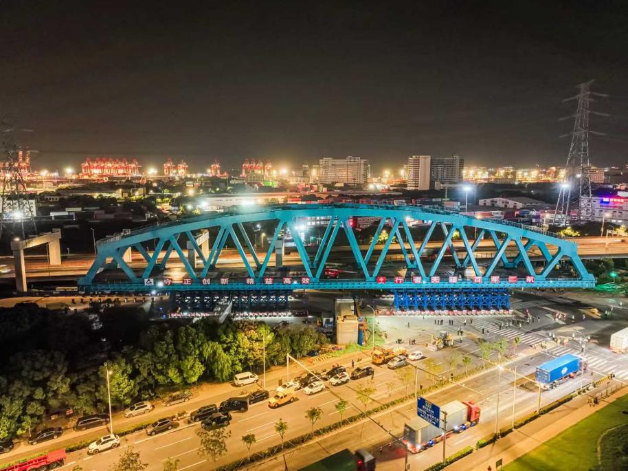 沪通铁路二期站前5标高桥特大桥跨径152米钢桁梁桥为标段控制性工程,该桥梁上跨杨高北路与港城路交叉口,毗邻外环高速,桥型结构为三线无竖杆整体节点曲弦三角桁架下承式简支钢桁梁,总长154.8米,桥面宽21.18米,桁高12至22米,桥总重达4996吨。该桥采用先异位支架拼装,后SPMT模块车智能整体移运架设的快速安装施工方法,为国内桥梁领域SPMT模块车整体移运的最大吨位记录,总吨位达5800吨(含支架)。