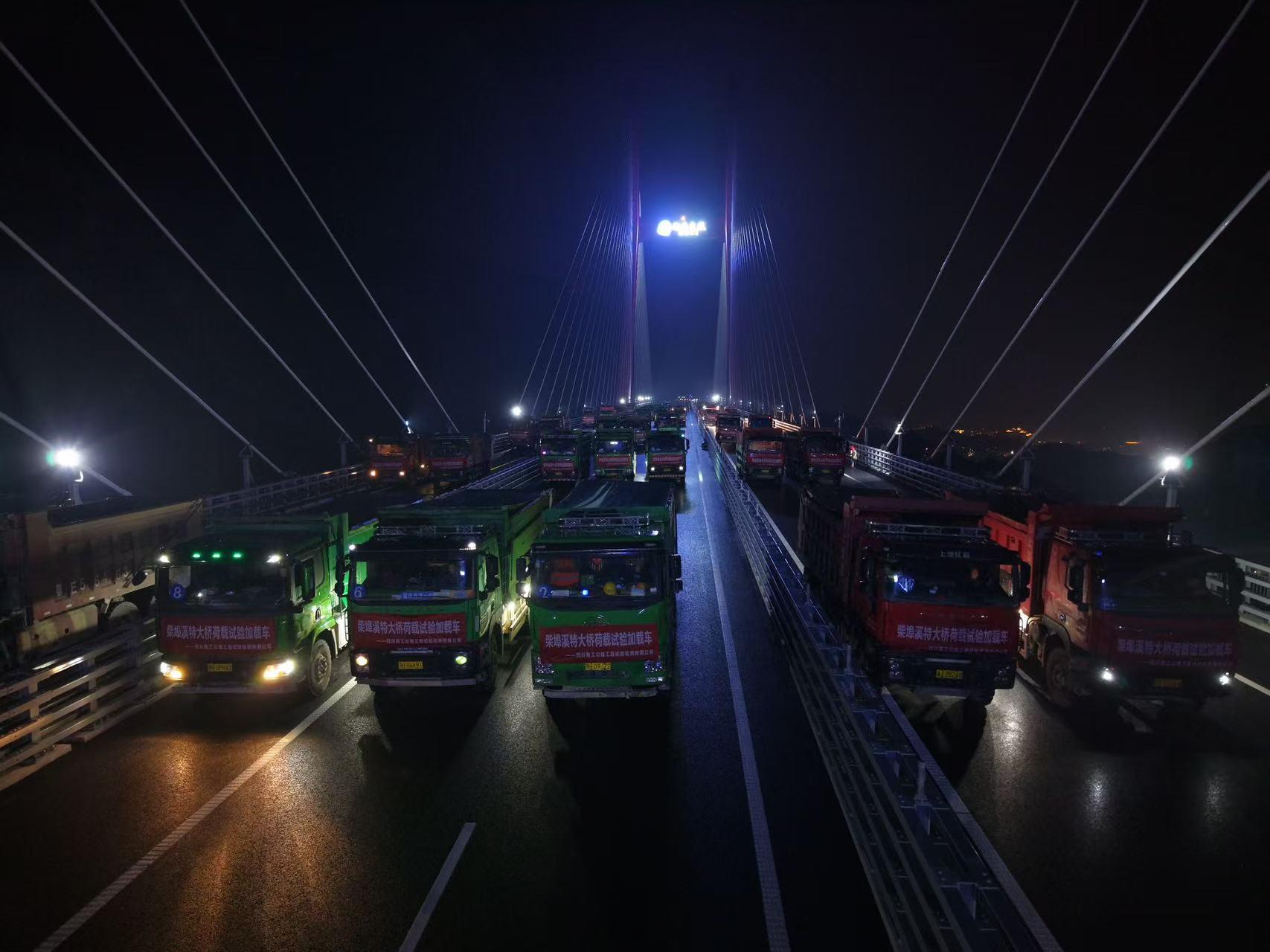 此次荷载试验以“全面覆盖、精准采集、严苛标准”为原则,构建了成桥状态测试、静载试验、动载试验三大测试体系,堪称一场对桥梁结构的“全身体检”。在静载试验中,19个测试工况层层递进,35吨级三轴载重车组成的重载车队轮番上阵,单次最大投入49台车辆形成1715吨的极限荷载——这一重量相当于300头成年大象的总重量。为捕捉核心数据,技术团队在桥梁关键部位密集布设190余个应变测点、50余个位移测点及40余个索力测点,对主梁挠度、应变分布、桥塔偏位、斜拉索索力等关键指标进行实时监测与精准分析。在动载试验中设置了15个工况,依次完成脉动测试、无障碍行车、有障碍行车及制动试验,获取了桥梁在动态荷载作用下的动应变、动挠度及冲击系数等关键响应数据。为规避昼夜温差对测试精度的影响,所有试验均在夜间气温稳定时段开展,技术人员三班轮岗、全程值守,用极致严谨保障了数据的准确性与权威性。
