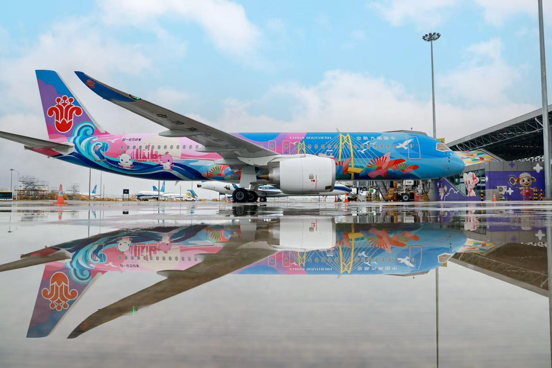 “大美湾区”号十五运会彩绘机是南航的第7架C919飞机,国产大飞机机队规模进一步壮大。目前,南航C919已经运营满一年,共计执飞过14个航点,安全飞行超过9700小时,累计承运旅客超59万人次,在上海、北京、武汉等航点实现常态化商业运营,同时已形成广州、长沙两地运营的格局。