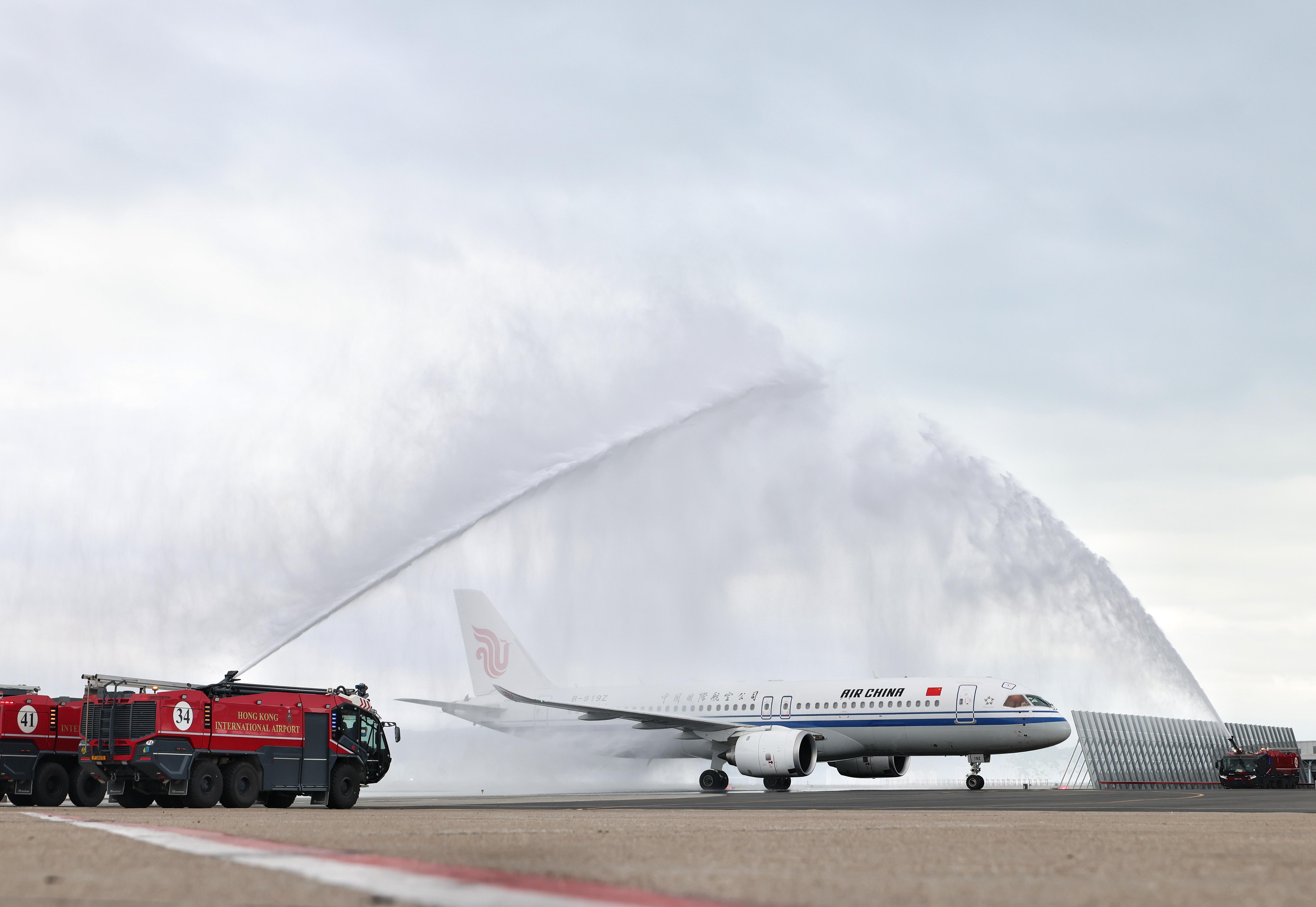 11月7日11时36分,中国国际航空股份有限公司(简称国航)CA101航班平稳降落在香港国际机场,国产大飞机C919首次身披五星红旗执行北京至香港航线,飞机缓缓穿过水门,接受民航界最高礼遇。当天下午,中国民用航空局、香港中联办、香港特区政府相关机构、爱国组织、“两航”联谊会、中航集团、在港中资企业及媒体代表等各界嘉宾120余人汇聚一堂,共庆C919载旗执飞香港航线圆满成功,并举办“国航C919重飞‘两航起义’北飞光辉航程”系列主题活动启动仪式,嘉宾代表共同按下启动装置,宣布活动拉开帷幕。