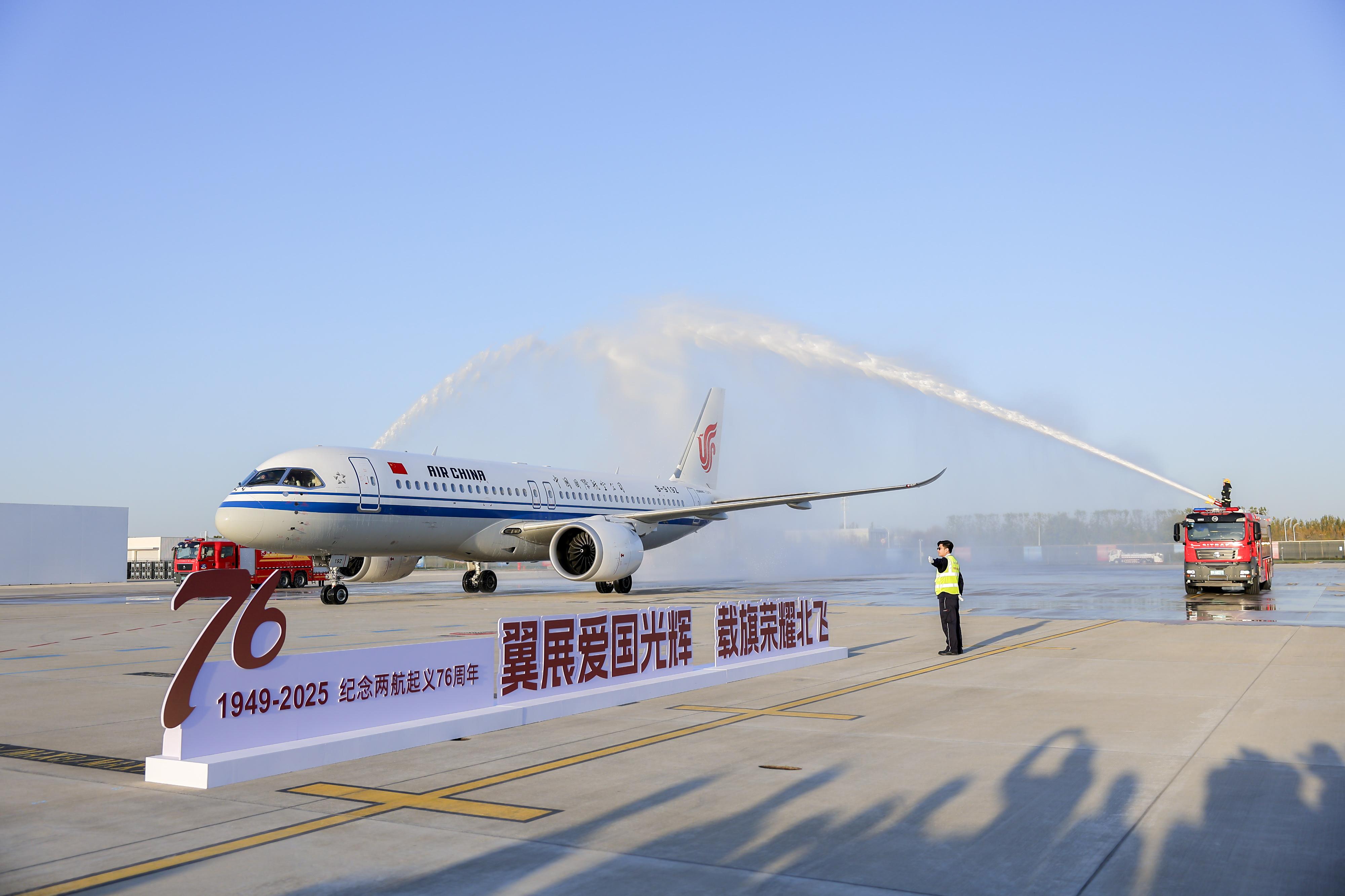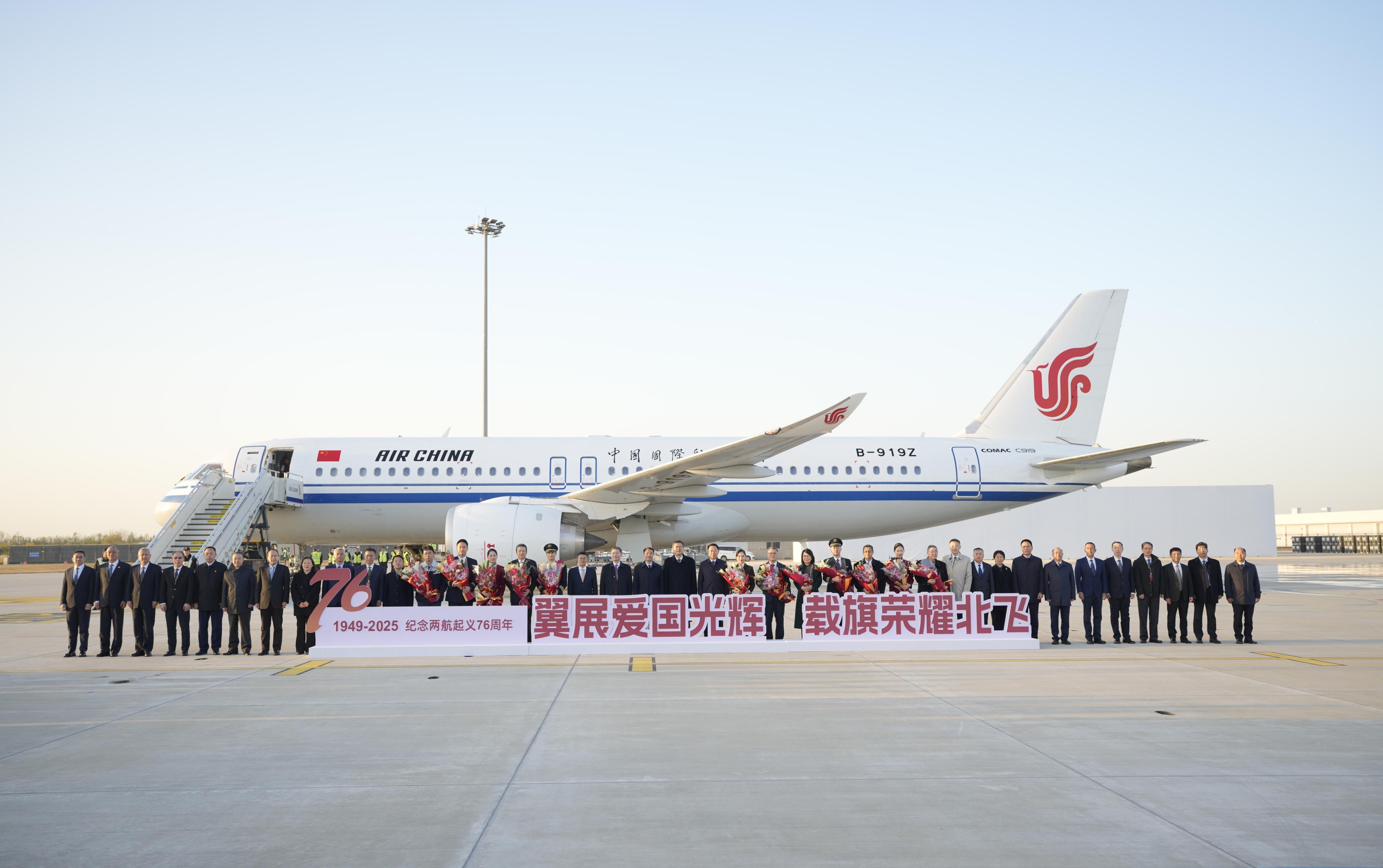 11月9日,为纪念“两航起义”76周年,传承弘扬爱国主义精神,中国航空集团有限公司(以下简称“中航集团”)举办“翼展爱国光辉 载旗荣耀北飞——国航C919重飞‘两航起义’北飞光辉航程”系列主题活动。此次活动通过国航C919重飞“两航起义”航线主题航班和天津“两航起义”展馆首展“空地联动”,追溯新中国民航事业的开端,致敬“两航起义”的爱国壮举,礼赞中国民航事业的先驱者与奠基人,生动呈现了新时代民航建设的跨越式发展。