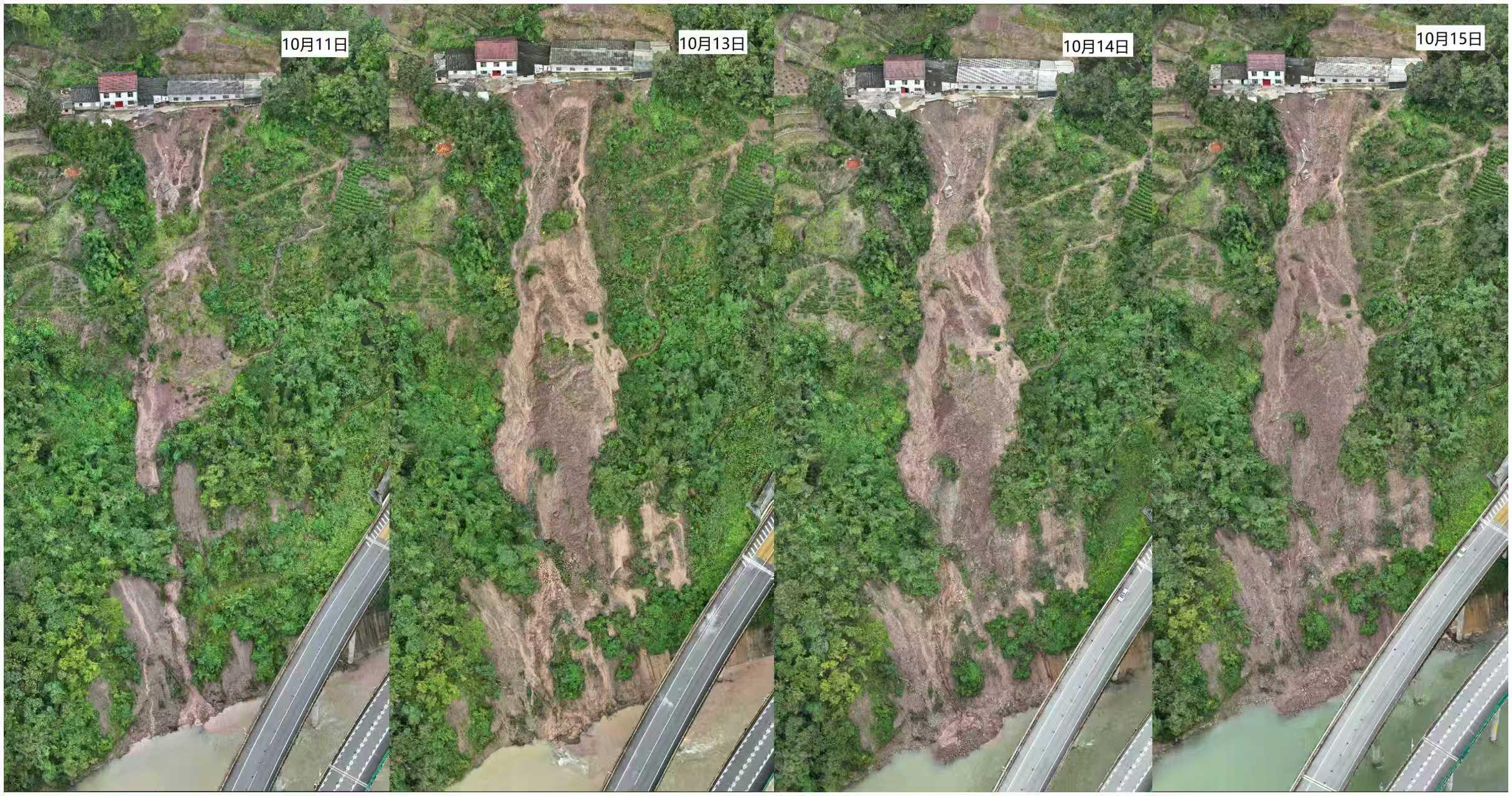 接下来几天,险情还在加剧:10月8日,坡顶民房挡墙开始下滑,山体出现局部小范围滑坡;10日,山体裂缝宽度扩大至20厘米,错台高度达50厘米,二级坡体左侧发生大面积垮塌;13日,二级滑塌体前缘全部垮落,大桥桥墩面临的威胁进一步升级。