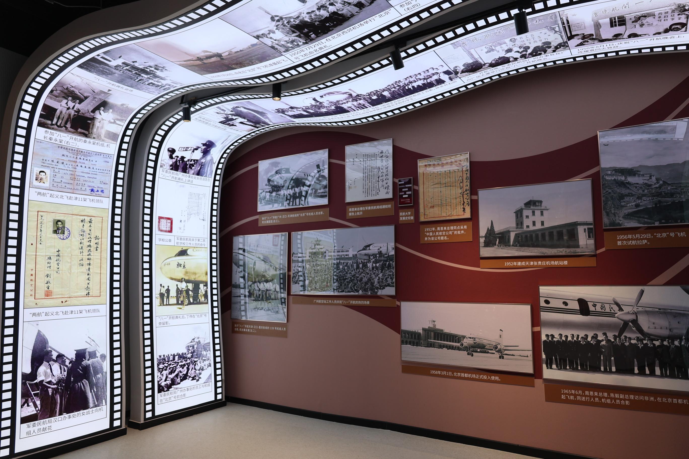 与历史“对话”。主展馆展览以“两航起义”为开端,展现新中国民航的发展历程。它以时间为顺序,通过“伟大决策、密筹义举”“祖国召唤、奋翼北飞”“万众一心、奠基伟业”“建设祖国、传承荣光”4个部分,呈现在中国共产党领导下,“两航起义”的完整过程;“砥砺前行、志在苍穹”“大国重器、逐梦蓝天”两部分,则展示了自“八一开航”之后新中国民航的发展。为了让参观者能够沉浸式地与历史“对话”,展览在运用图片、沙画、实物、场景还原等形式的基础上,设置裸眼3D体验,带领参观者重温北飞的光辉航程,随后还可以“乘坐”国产大飞机C919飞越祖国的壮丽山河。