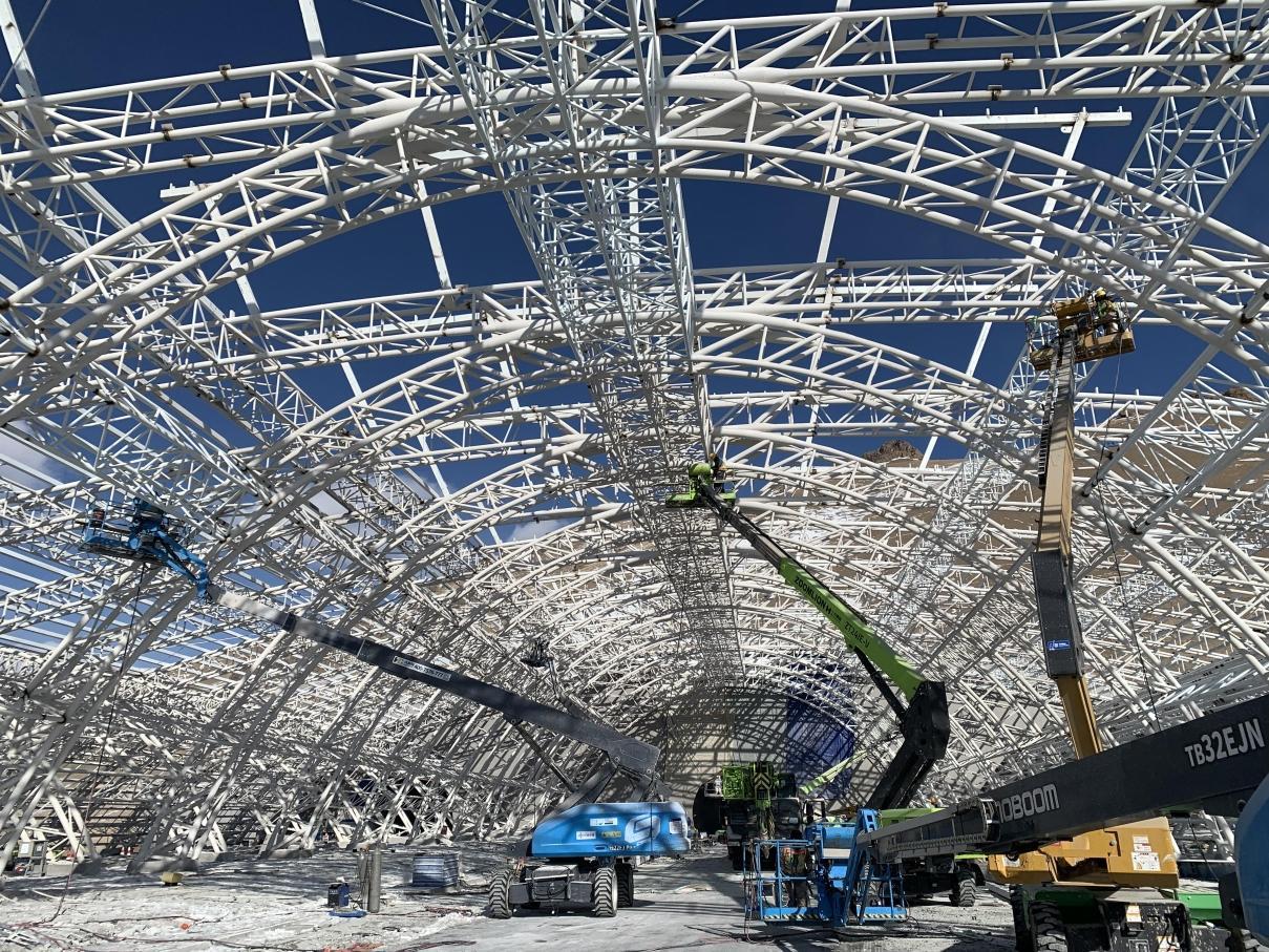 11月13日,G0711乌鲁木齐至尉犁高速公路“咽喉”工程——天山胜利隧道出口端,一片忙碌场景,工人们正加紧焊接加长棚洞钢结构,棚洞总体造型已见雏形。